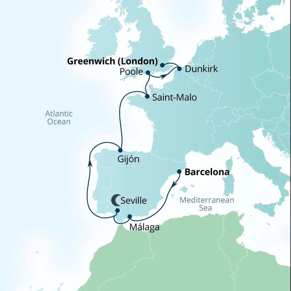 Explore Seabourn Venture's 13-night Spanish Nights & Storied Coasts cruise from Barcelona to Greenwich, visiting Spain, France and England in ultra-luxury.