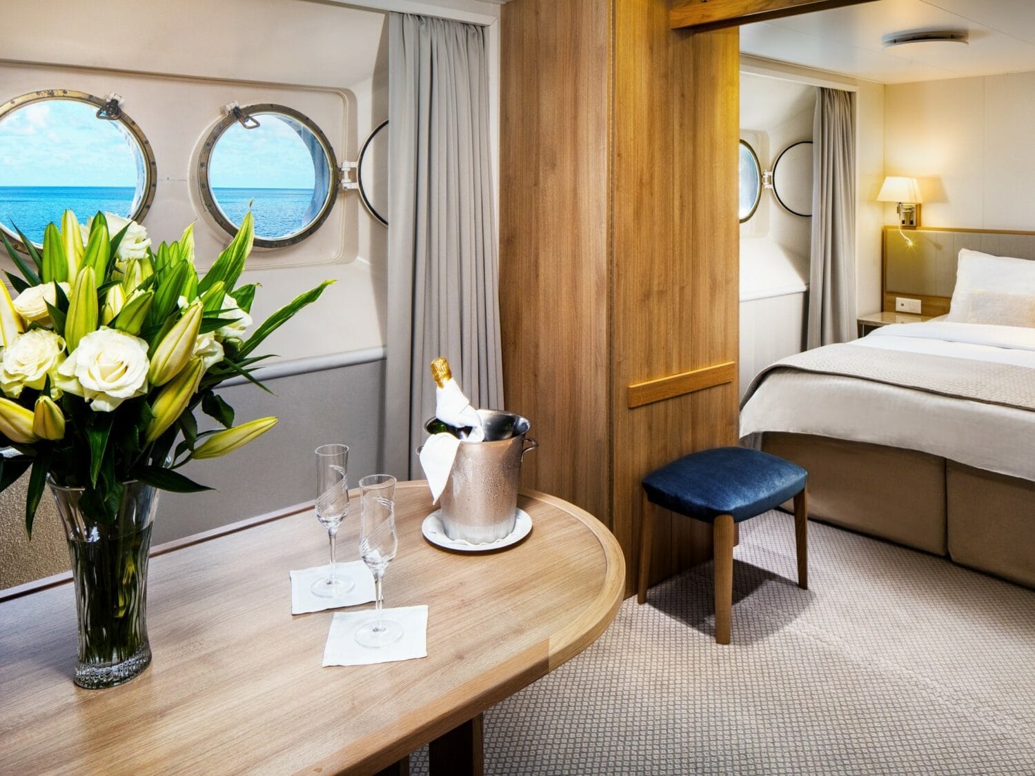 SeaDream staterooms include features like a sitting area, ample storage, a flat-screen TV, and a minibar stocked with complimentary soft drinks. Guests are pampered with personalised service, including nightly turndown with chocolates and plush robes and slippers.