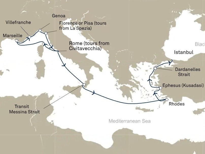Discover the Mediterranean on a 14-night cruise through France, Italy, and Turkey, blending culture, cuisine, and coastal elegance.