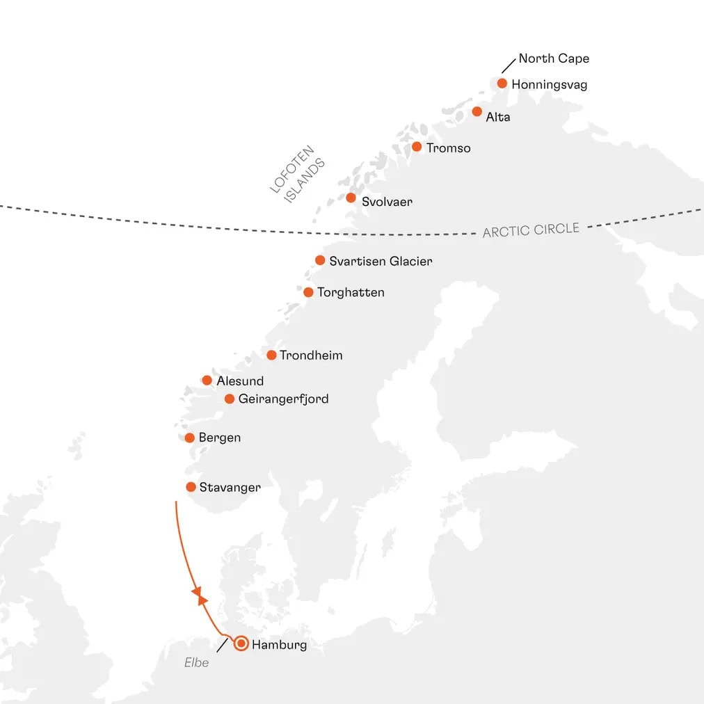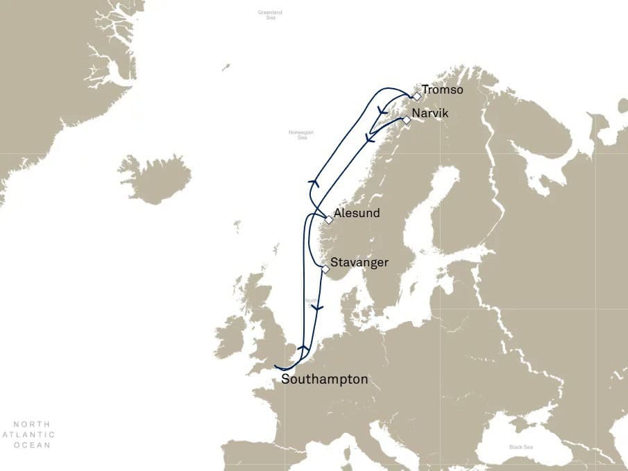 Chase the Northern Lights on a 12-night Norway cruise featuring late stays in Tromsø and Narvik and daytime explorations of scenic towns like Ålesund.