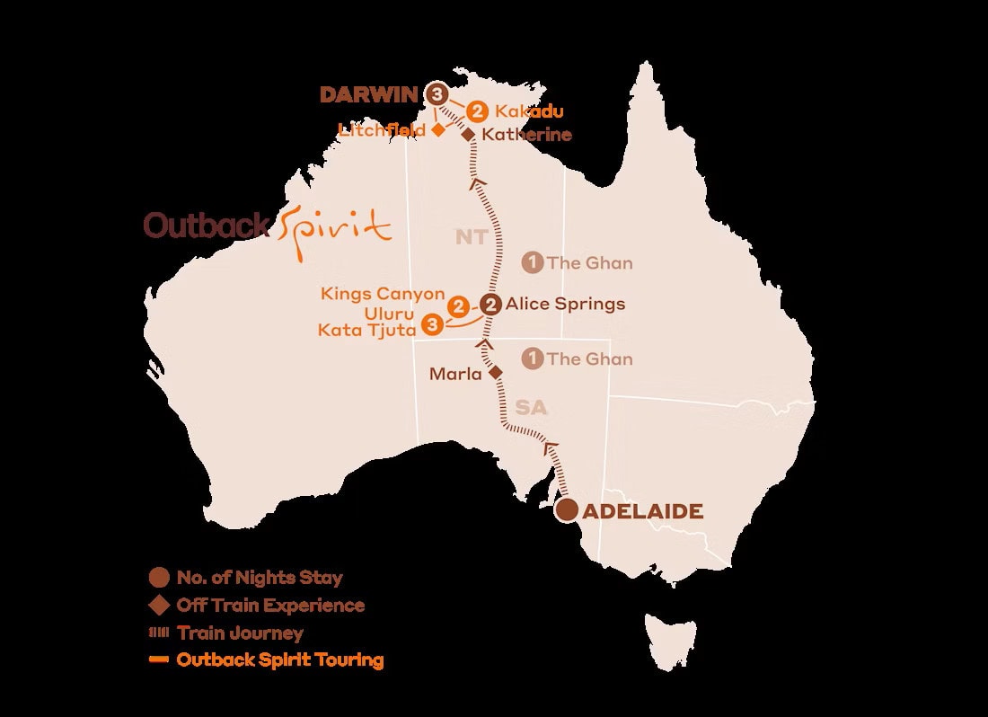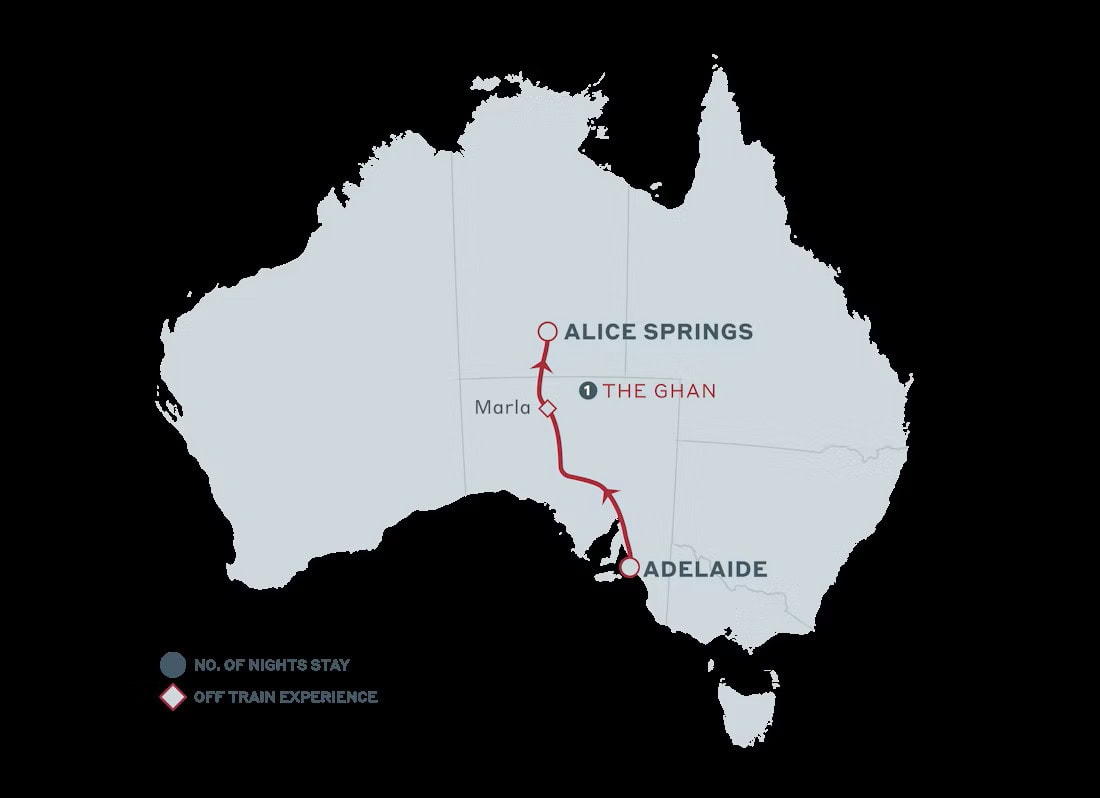 4 days / 3 nights aboard The Ghan Expedition, travelling from Darwin to Adelaide
