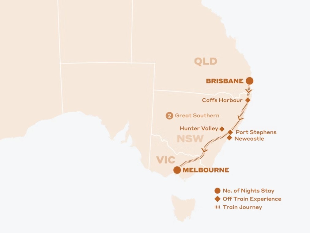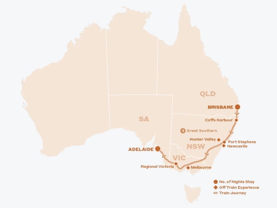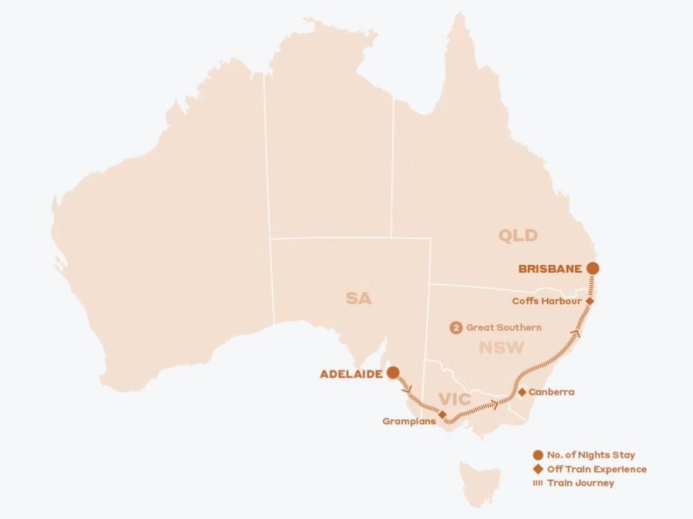 Journey between Adelaide and Brisbane aboard the Great Southern, a seasonal rail experience that captures the essence of an Australian summer. From rolling countryside to sunlit coastlines, every moment on board celebrates the beauty and diversity of this vast land.